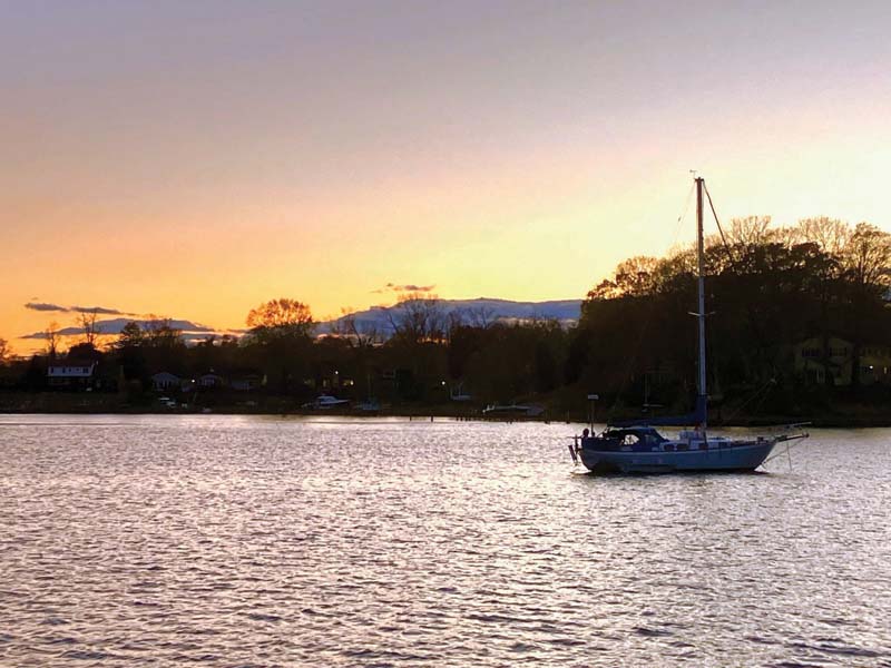 Like the hours of the day, the miles ticked steadily by until I doused sail under a late afternoon sun and motored up the Patuxent, where I would wait out the next day’s front and its brisk south winds. The anchor spilled over the roller into 10 feet of water, caught the bottom, and Ave swung around to rest.